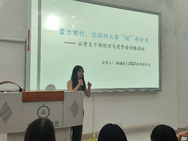 随后进行的专业经验分享环节中,2022级胡娴淑、马竹江和2023级罗睿华三位同学结合自身学习与实践经历,分享了英语专业的学习方法、兼职经验、学生工作与奖学金申请等方面的宝贵经验。马竹江同学从英语学习、在读兼职两个方面分享了英语专业如何“边学边用”。胡娴淑同学以“学生工作与奖学金攻略”为主题,鼓励学弟学妹们积极参与校园活动,提升综合素养;罗睿华同学则从“打破舒适圈”的角度出发,激励大家勇于尝试、不断突破自我。