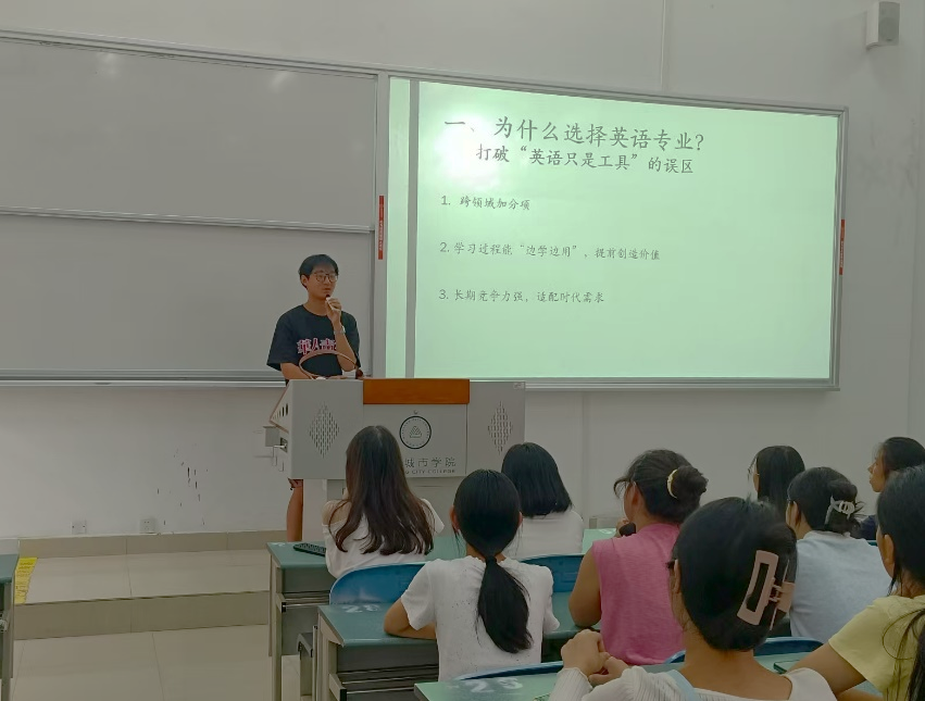 活动在李思佳老师的主持下拉开帷幕。第一环节为专业认知教育,黄晓雪老师从专业发展、课程体系、师资力量、人才培养目标等方面进行了系统介绍,帮助新生建立起对英语专业的整体认知。她强调,英语专业不仅注重语言技能培养,更强调跨文化交际能力与教育教学实践能力的综合提升。