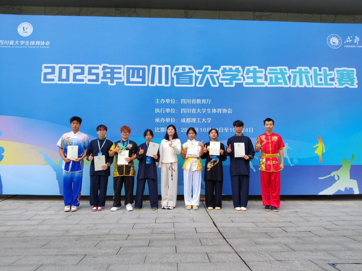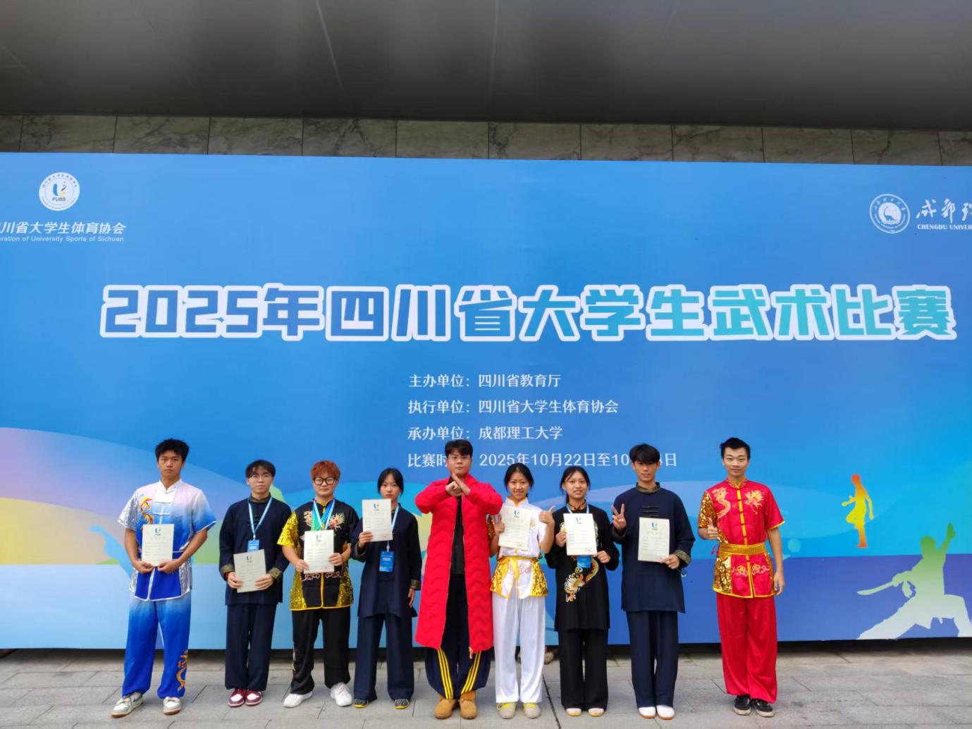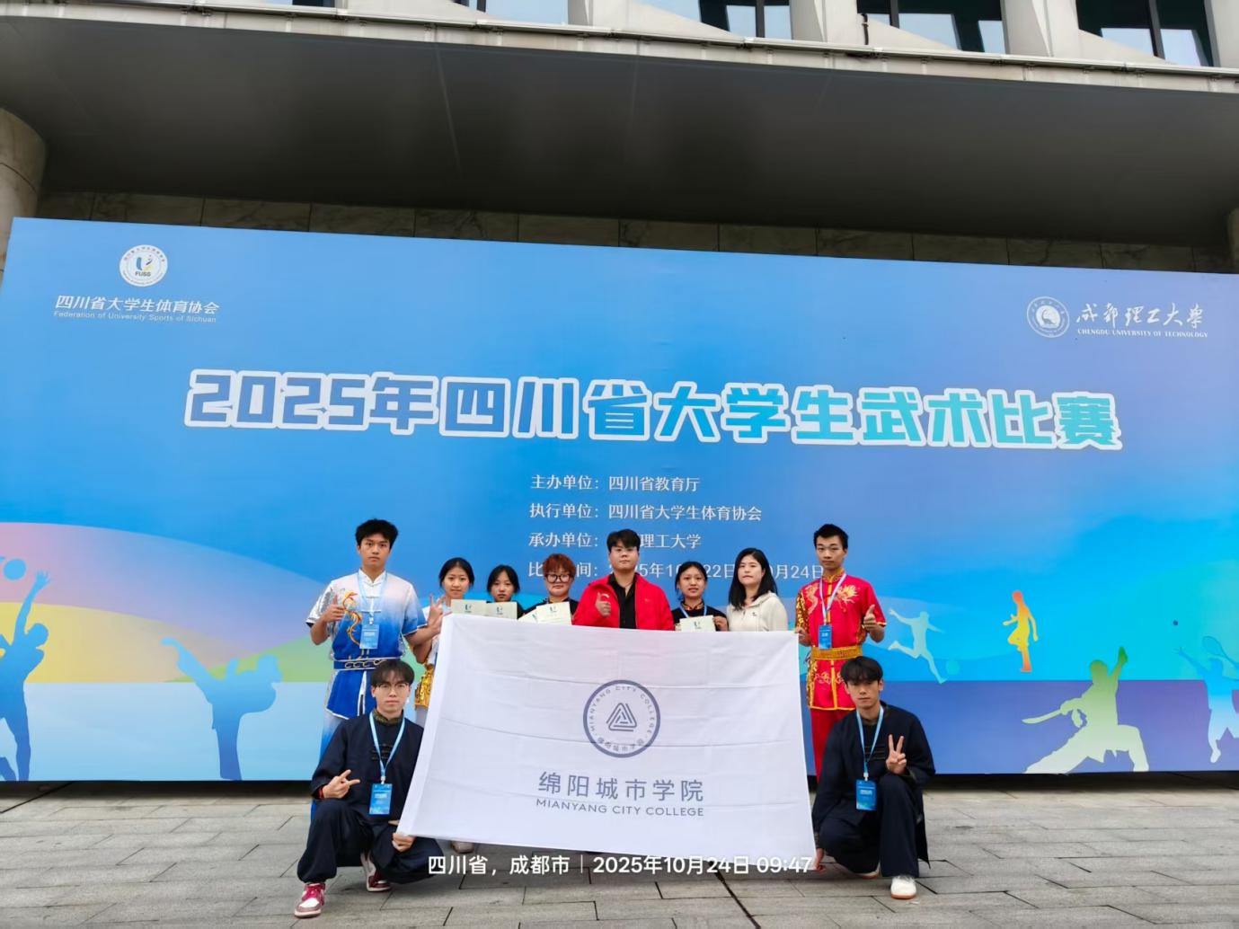 2025 年 10 月 22 日至 24 日,由四川省教育厅主办、四川大学生体育协会执行的 “2025 年四川省大学生武术比赛” 在成都理工大学圆满落幕。作为省内大学生武术领域的标杆赛事,本次大赛共吸引全省 55 所高校代表队、419 名运动员同台竞技。赛事启幕后,各高校队伍齐聚蓉城,高手云集、角逐激烈,充分展现当代大学生的武术功底与竞技风采。其中,绵阳城市学院学子毫不怯场,以饱满热情与昂扬斗志全力以赴,从容迎接每一场挑战,展现出良好的精神风貌。