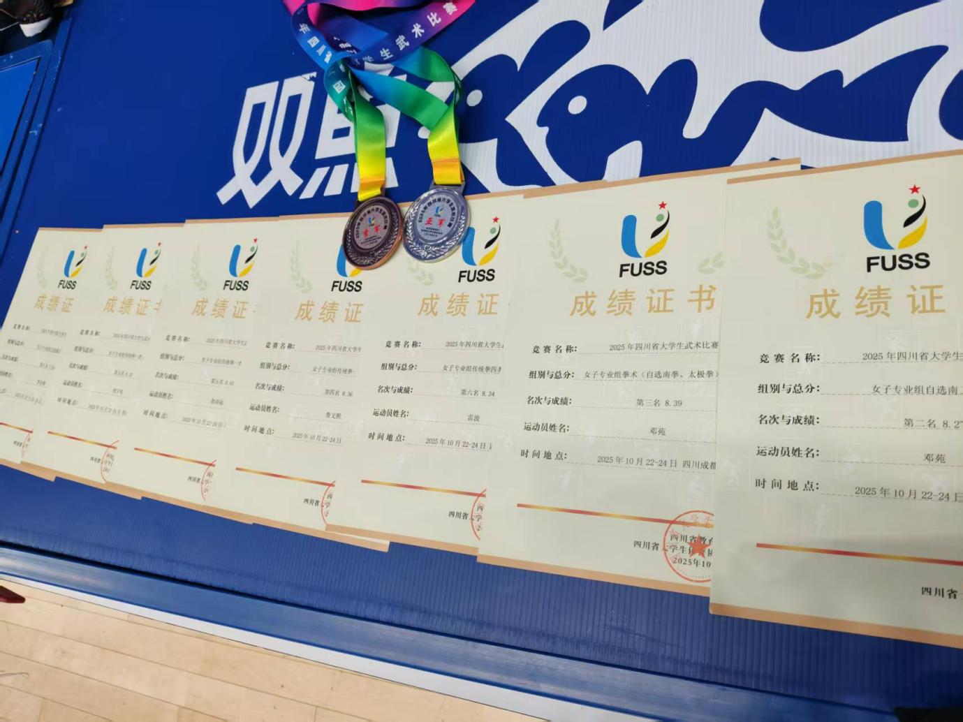 绵阳城市学院武术代表队由现代服务学院组建,在领队张自强、指导教练张良与邹光辉的共同带领下,8 名学子鲁清福、李忠樑、贺金枫、郭伦豪、邓苑、雷波、鲁文熙、唐子琴怀揣对武术的热爱与执着出征赛场。他们奋勇拼搏,凭借扎实的功底、出色的临场发挥和昂扬的精神面貌屡创佳绩,最终斩获拳类项目 1 个第三名、1 个第四名、2 个第五名、1 个第六名,器械类项目 1 个第二名、1 个第八名的优异成绩,不仅为学校赢得荣光,更充分展现了城院学子积极向上的青春风采。