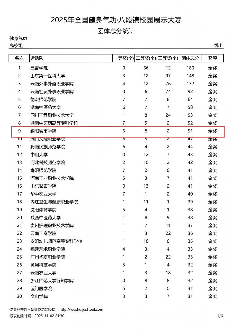 热血青春,捷报飞扬!近日,2025年全国健身气功·八段锦校园展示大赛圆满收官,我校参赛师生凭借青春朝气与硬核实力强势出圈,从全国172所高校、1690支队伍中奋勇突围,我校派出15支队伍,以团体总分全国排名第九的亮眼战绩斩获团体金奖,用拼搏为校争光,用风采诠释传统!