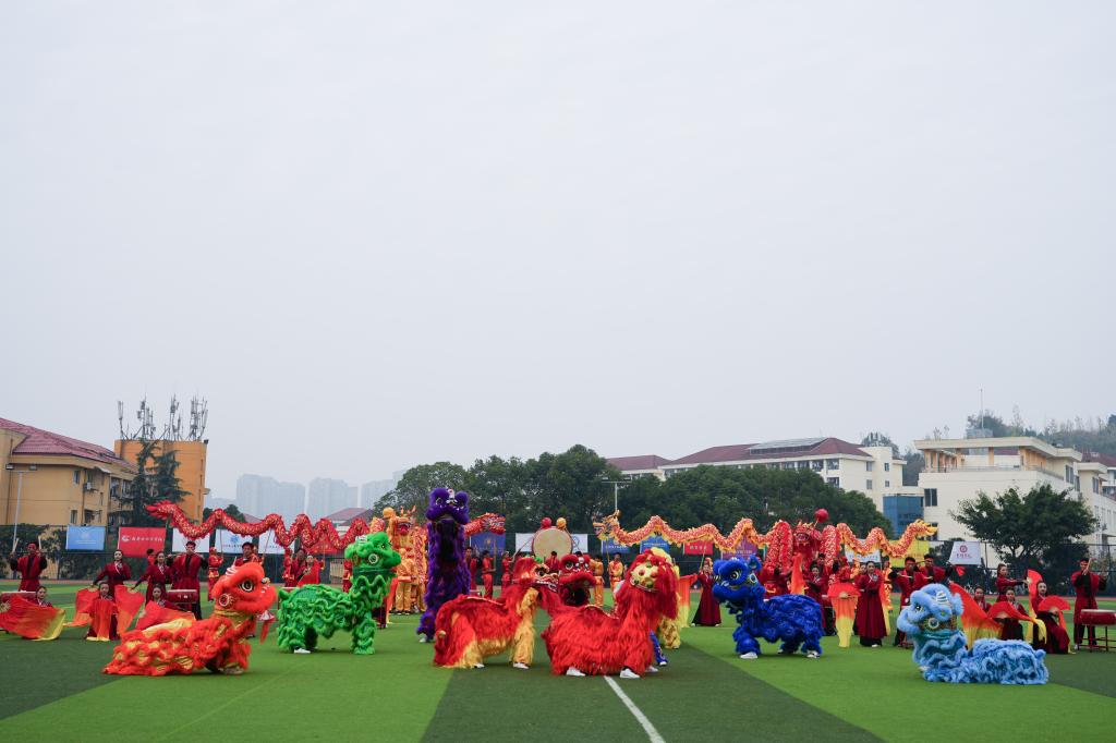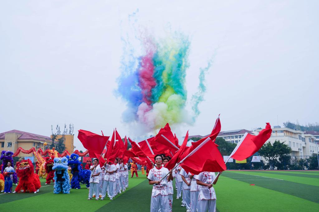 宣誓环节后,开幕式文艺表演《川韵武魂・盛世华章》精彩上演,以“青春铸魂、刚柔并济、礼赞盛会”为主题,融合武术旗舞、竞技武术、古典舞、舞龙舞狮四大传统艺术形式,分五个篇章层层递进:开篇旗鼓齐鸣彰显民办高校携手同心的气势;第二篇章,武术专选班学生展示长拳、南拳等竞技武术,刚劲动作诠释“精武强国”的青春担当;第三篇章,80人旗舞变换方阵、太极图等造型,寓意学子凝心聚力;第四篇章,30人古典舞融合扇舞元素,以温婉的舞姿展现传统文化底蕴;第五篇章,4条长龙、8头雄狮登场翻腾,组成“首届民运”造型收尾,为赛事送上吉祥祝福,现场掌声与欢呼声此起彼伏。