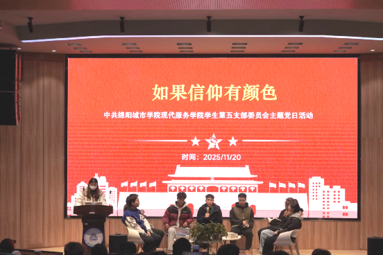 为深入学习贯彻党的精神,传承红色基因、厚植爱国情怀,2025年11月20日晚,现代服务学院学生第五支部委员会于守正书院会堂成功举办了“如果信仰有颜色”的主题党日活动。活动由支部书记董青松主持,创新采用“线下沉浸+抖音直播”的形式,打破了传统党日活动的时空限制,助力红色经典在新时代焕发新的活力。