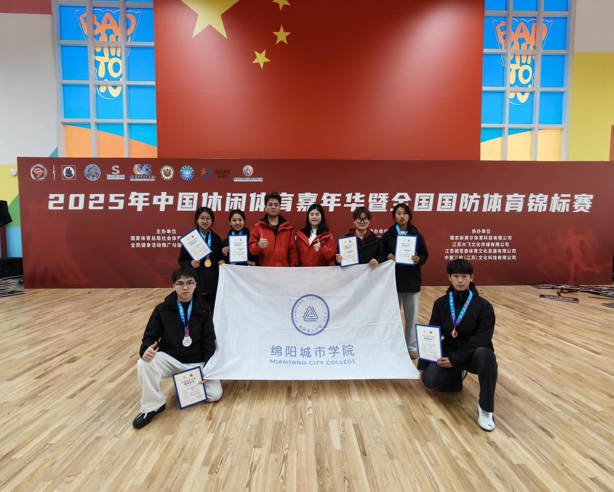2025年12月6日至7日,由国家体育总局社会体育指导中心主办的“2025年全国国防体育运动锦标赛”在江苏省江阴市飞马体育公园圆满落幕。作为全国国防体育运动的顶级赛事,共吸引了来自全国22个省65支代表队,2000余名运动员参赛,竞争异常激烈。绵阳城市学院武术队学子毫不怯场,以饱满热情与昂扬斗志全力以赴,从容迎接每一场挑战,展现出良好的精神风貌。